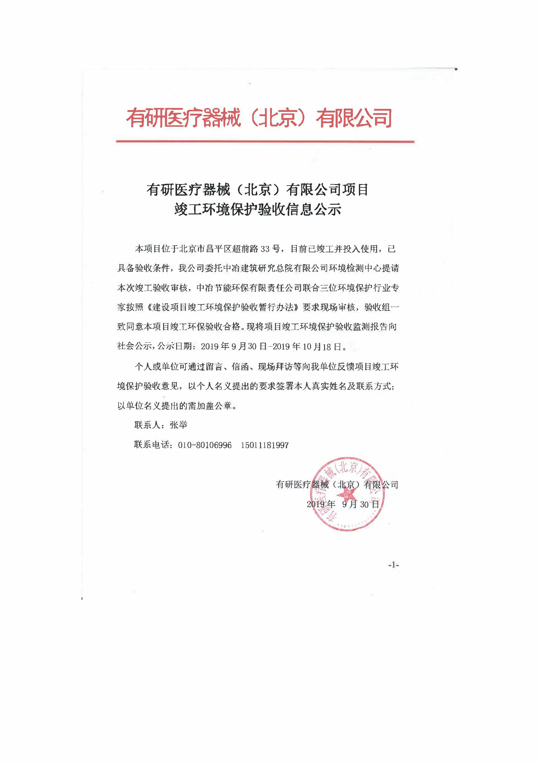 有研醫(yī)療器械(北京)有限公司項目竣工環(huán)境保護驗收信息公示...